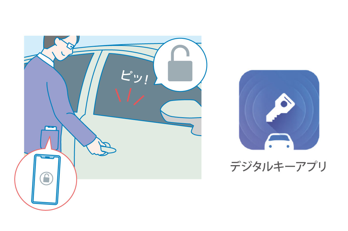 ※ご利用には、新車ご注文時にデジタルキー(メーカーオプション)のご購入が必要となります。 ※デジタルキーが利用できない状況に備えて、常にクルマのキーも携帯いただくことを推奨いたします。