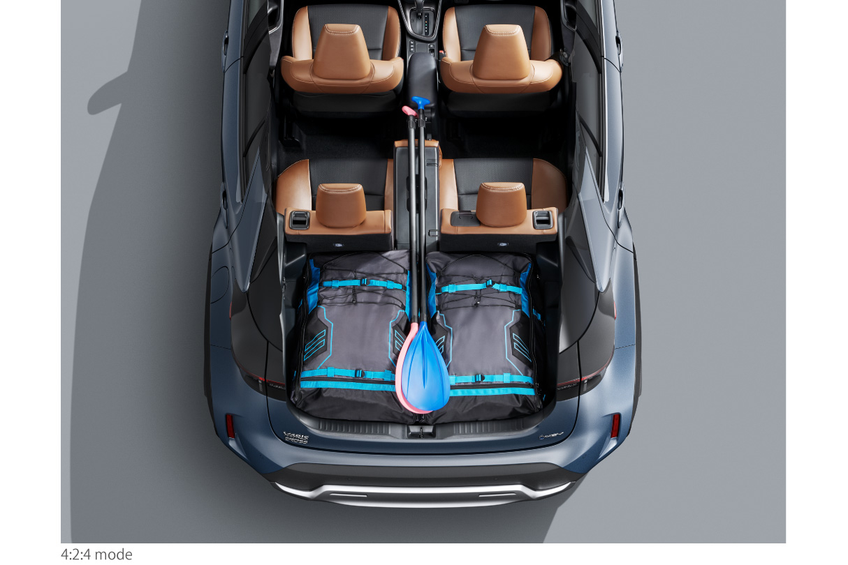 載せる荷物に応じて荷室床面の高さを2段階に調節できます。6:4で左右分割することもできるので、背の高さの違う荷物を運ぶときに便利です。4:2:4分割可倒式リヤシートと組み合わせることで、多彩なデッキアレンジが可能になります。